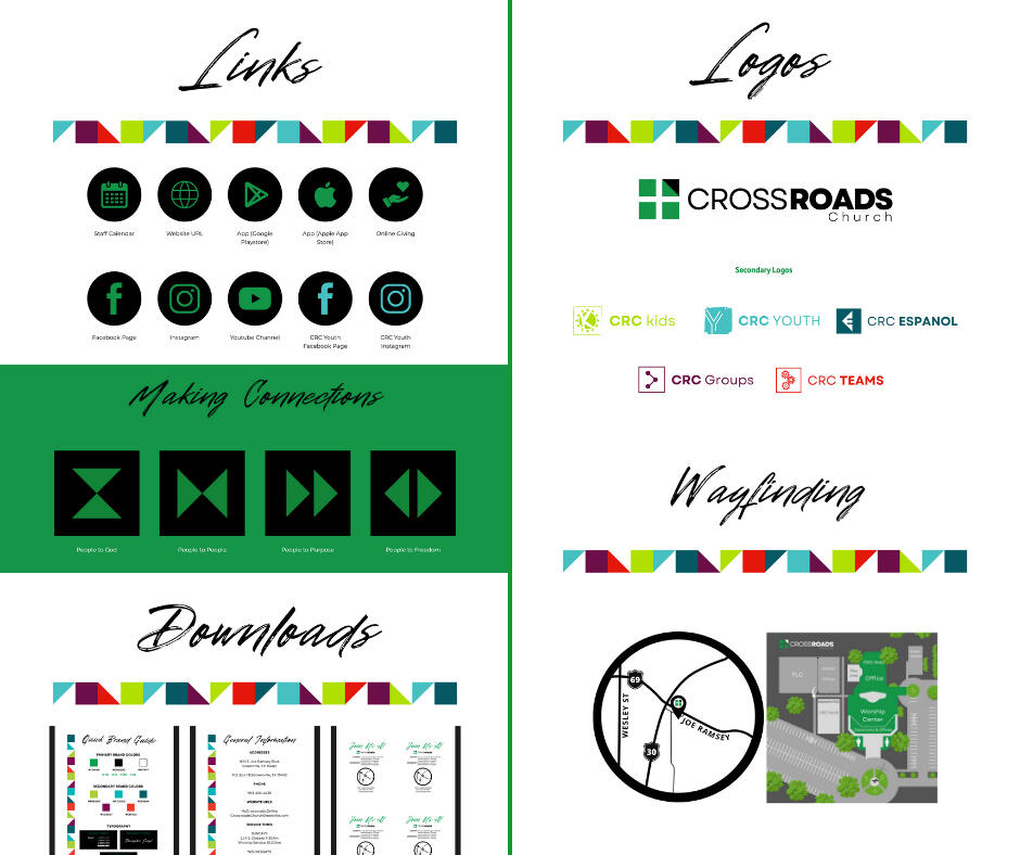 Main logo refresh, logo family for complex structure, visual direction, website design & development for the church, website & development for a brand guide website for staff, announcement slides, and printed materials including design, print set up, and production coordinating.